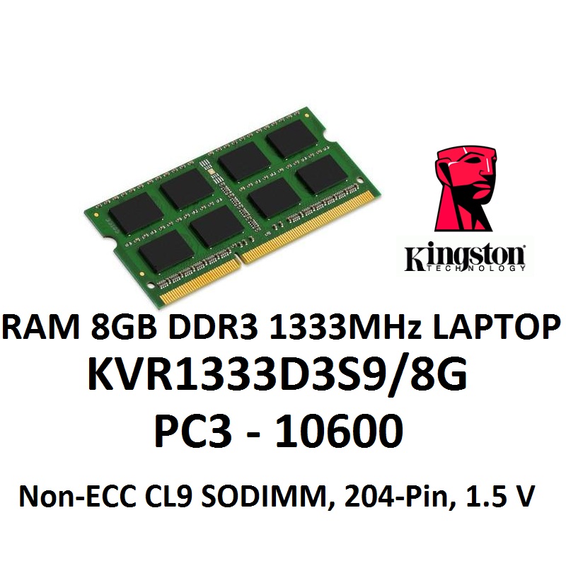 RAM 8GB DDR3 LAPTOP 1333MHz, PC3 10600, NON ECC, Kingston KVR1333D3S9/8G