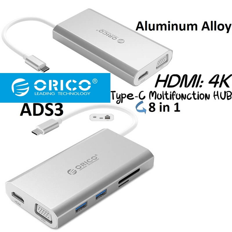 ORICO USBC Multifunction HUB, Aluminum Alloy, Type-C, 8 in 1, HDMI 4K, VGA, RJ45, USB3.0-A * 2, TF/SD, Type-C (Charge), Windows / Mac OS, ADS3