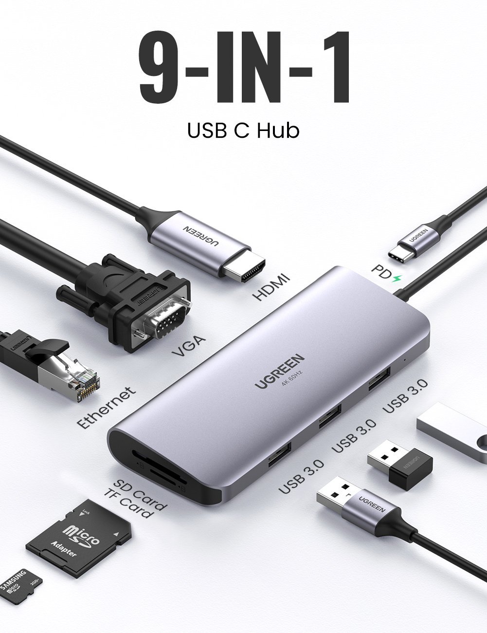 UGREEN USB C Hub USB Type C to 4K HDMI Multiport Adapter Dock with VGA ( 9 in 1 ) Gigabit Ethernet Port Support 4K UHD HDMI 100W PD Fast Charging