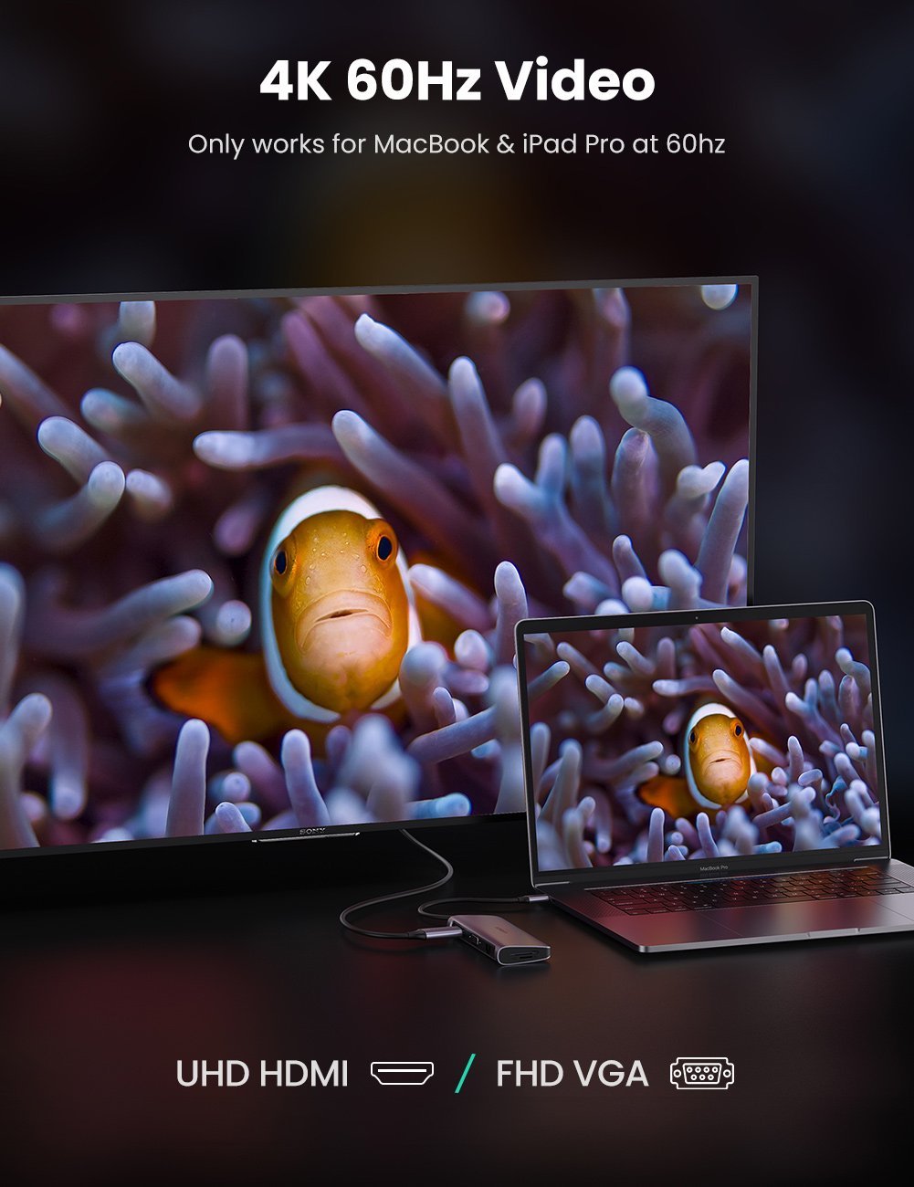4K HDMI أو 1080p Vga. تتيح لك إمكانية عكس أو توسيع الكمبيوتر المحمول من النوع c إلى تلفزيون عالي الدقة أو شاشة أو جهاز عرض. يدعم منفذ HDMI 4K كحد أقصى 3840 × 2160 عند 30 هرتز UHD ؛ يدعم منفذ VGA كحد أقصى 1920x1080 عند 60 هرتز Full HD. ملاحظة مهمة: لا يمكن استخدام مخرجات الفيديو HDMI و VGA في وقت واحد.