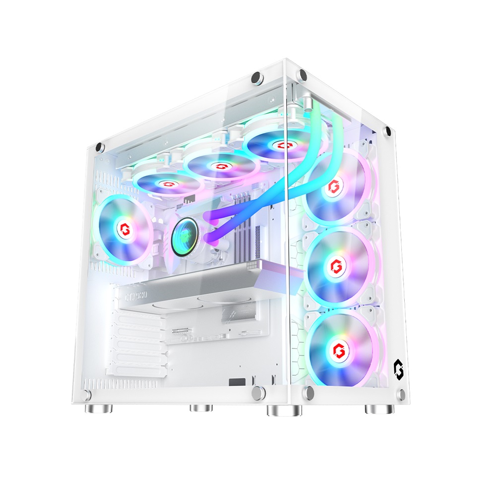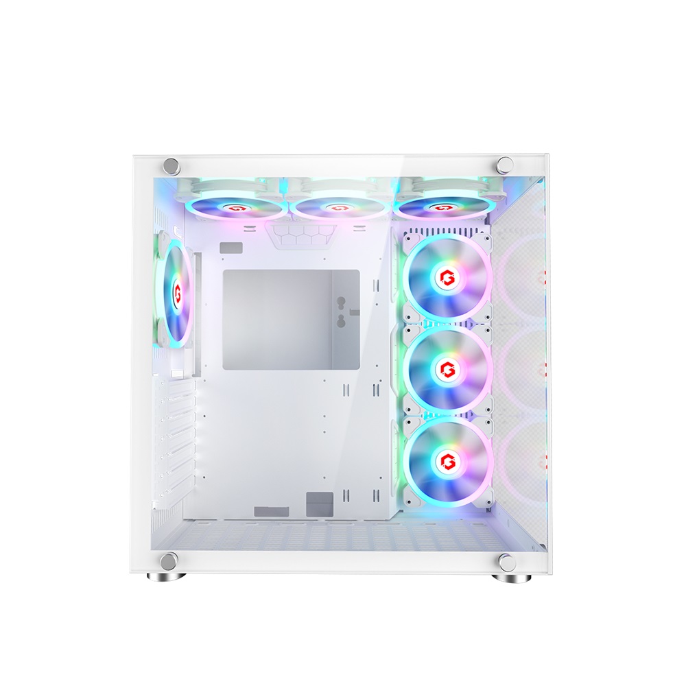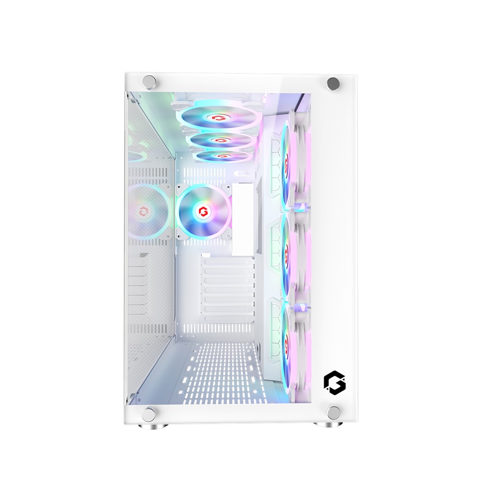 - علبة كمبيوتر للألعاب من سلسلة Emperor Arctic II متوسطة الحجم من GameOn – بيضاء (7 مراوح)