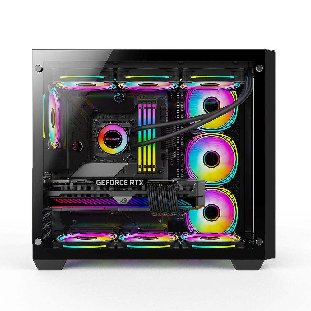 - علبة كمبيوتر Huntkey S980 Tornado Full View Edition Mid Tower – أسود، 4 مراوح