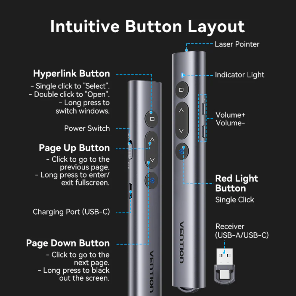 Navigate through your presentation with confidence with the intuitive slideshow controls. Powerful and easy to see – even in brightly lit rooms – so your audience knows exactly what you’re pointing.