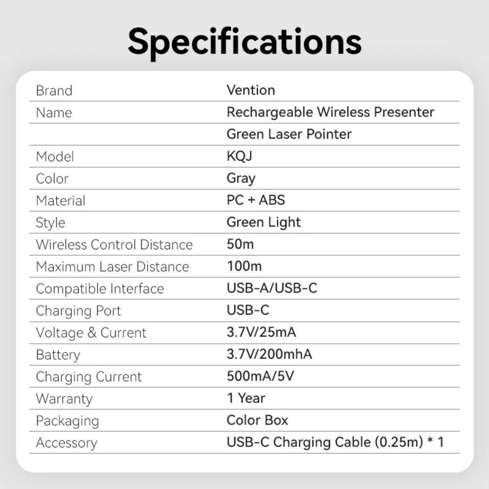 - فينشن KQJ جهاز تقديم لاسلكي بنقطة ليزر خضراء، مدى 100 متر، بمنفذي USB-A و USB-C