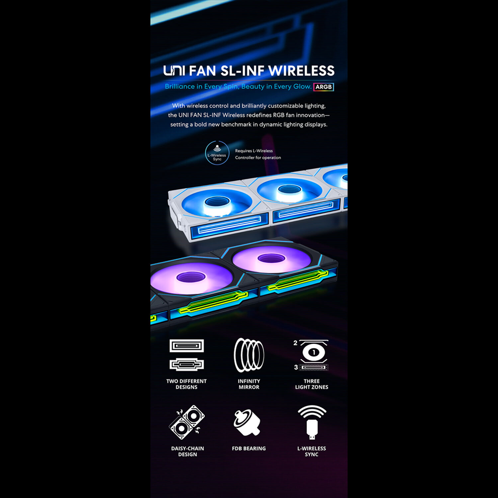 - مروحة LIAN LI UNI FAN SL-Infinity اللاسلكية مقاس 120 مم بإضاءة ARGB – باللون الأسود (قطعة واحدة) لا يشمل وحدة التحكم