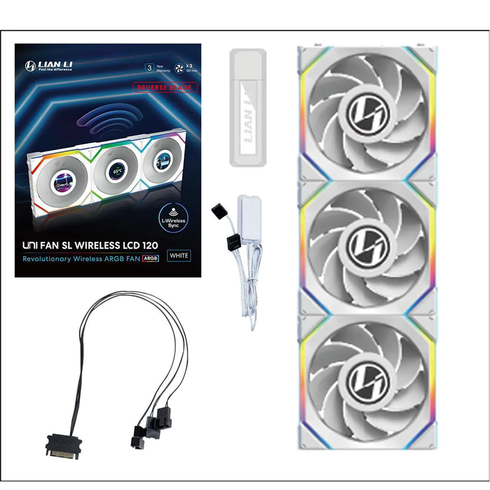 - مروحة Lian Li UNI FAN SL لاسلكية مع شاشة LCD وإضاءة ARGB بحجم 120 مم (ريش عكسية) – أبيض (حزمة من 3 مراوح)