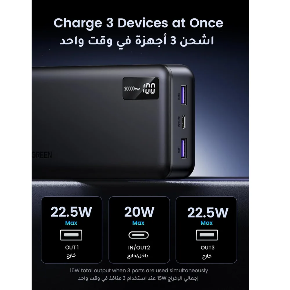 يو جرين (UGREEN) مدخل/مخرج USB-C مخرج USB-A (OUT 1/OUT 2) سعة البطارية: 20000 مللي أمبير