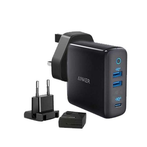 The 3-Port 65W Max Travel Charger with Worldwide Plug Set Anker PIQ3.0 is compatible with Power Delivery and Quick Charge 45W USB-C Port Charging for Laptops