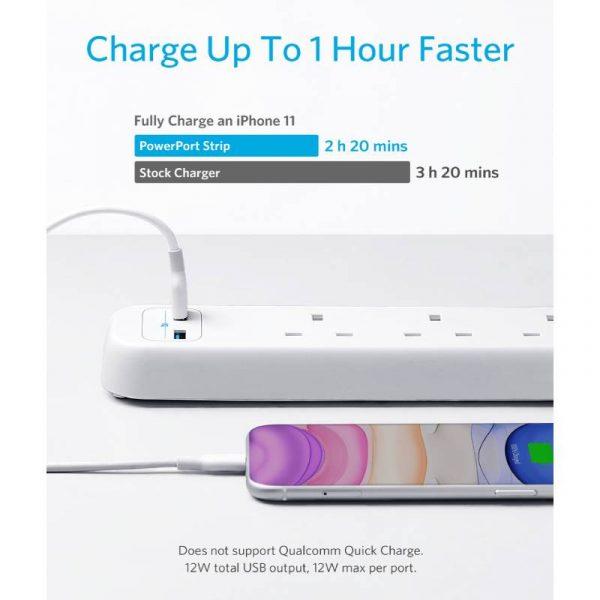 4 AC outlets, 2 USB ports, up to 1 hour faster charging (full charge iPhone 11 in 2 hours 20 minutes), 2m cable, LED indicator, 2860W AC outlets, 12W USB-A ports