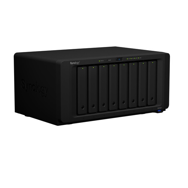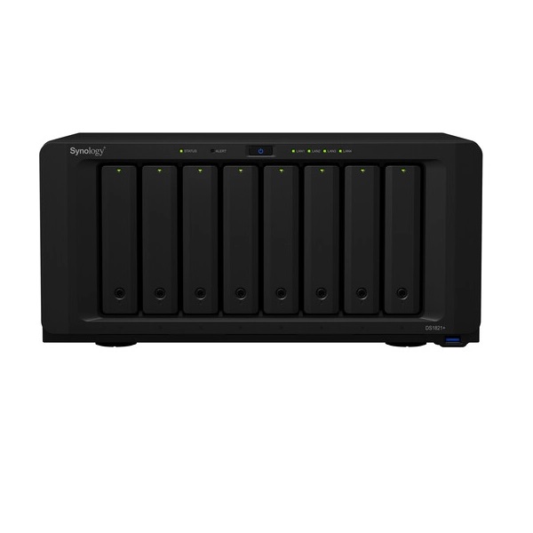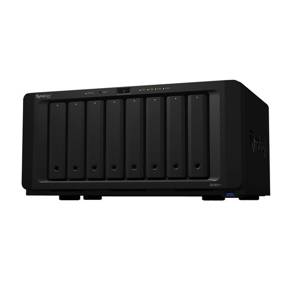The Synology DiskStation DS1821+ NAS enclosure is powered by a 2.2 GHz AMD Ryzen quad-core processor with 4GB of ECC DDR4 memory. It supports up to eight 3.5″ and 2.5″ SATA drives in RAID 0, 1, 5, 6, 10, Synology Hybrid, and JBOD modes with a maximum single volume size of 108TB.