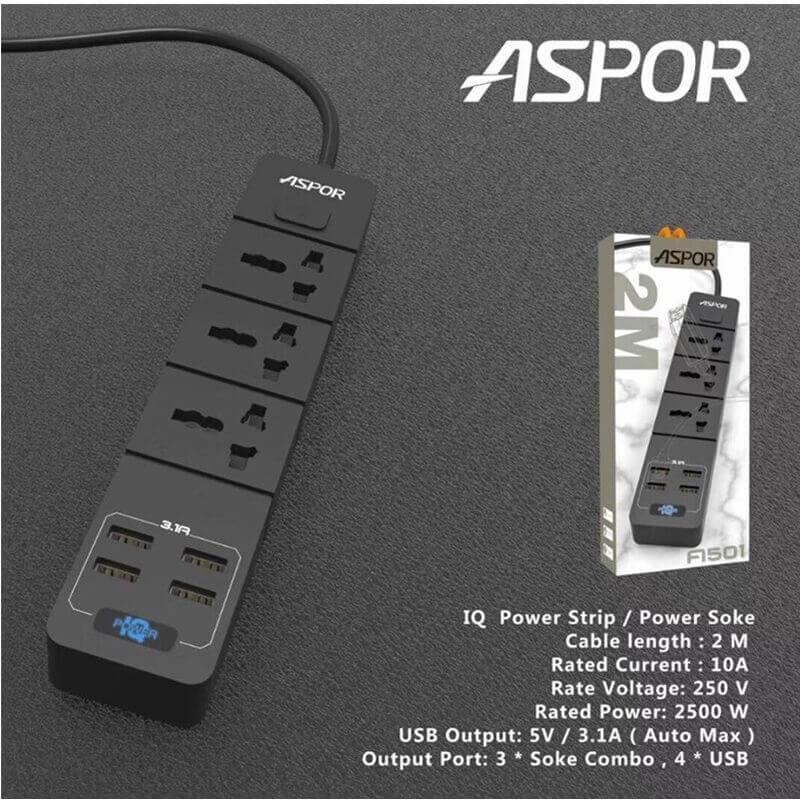 Aspor Power Strip 3 Electric Socket 4 USB Port A501, Black