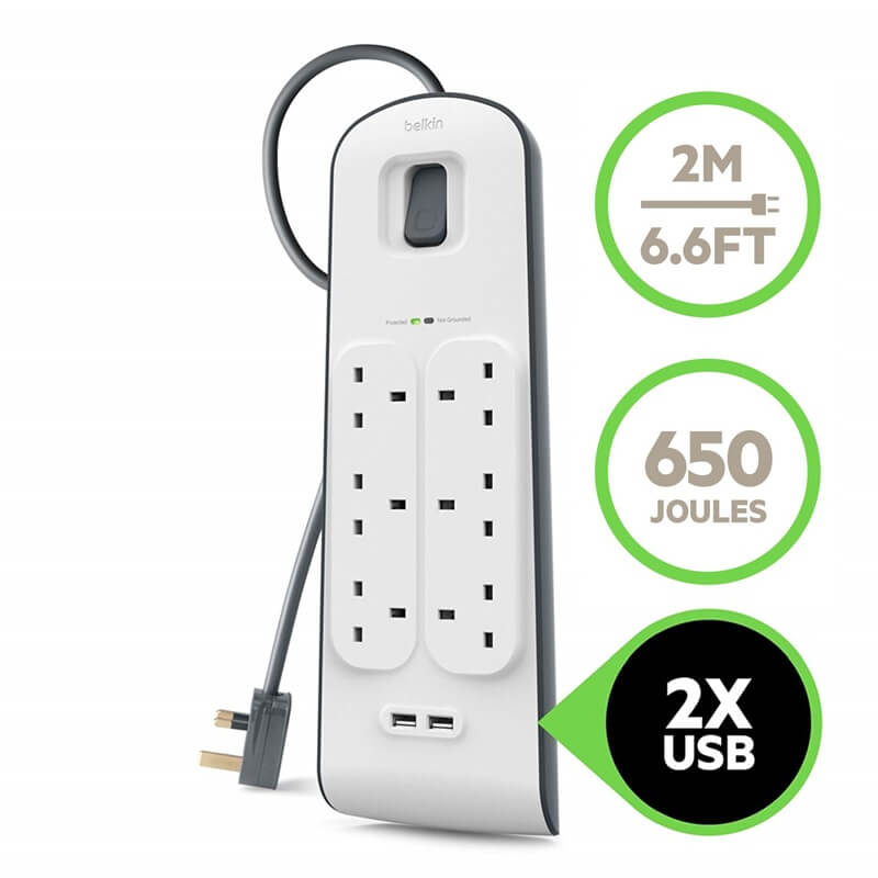 - Belkin BSV604 6-Outlet 2-Meter Surge Protection Strip with two 2.4 amp USB charging ports