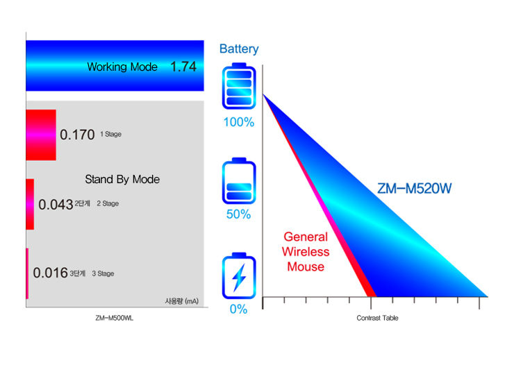 Zalman ZM-M520W wisely manage energy consumption, withstand a single charge up to two times longer than ordinary wireless mouse. This was achieved, implementing a three-stage battery-saving standby mode with prolonged immobility.