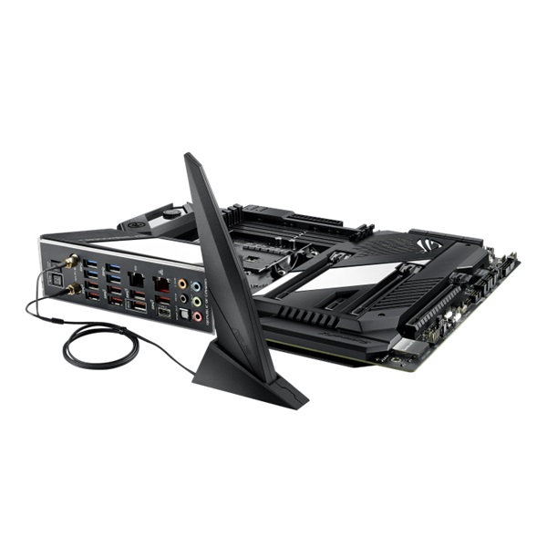 AMD AM4 socket: Ready for AMD Ryzen™ 5000 Series/ 4000 G-Series/ 3000 Series/ 3000 G-Series/ 2000 Series/ 2000 G-Series desktop processors; also supports up to two M.2 drives and features USB 3.2 Gen 2 and AMD StoreMI to maximize connectivity and speed Comprehensive thermal design: Integrated Crosschill EK III, active chipset heatsink, M.2 aluminum heatsink, and ROG Cooling Zone. Robust power delivery: Designed power solution with 14+2 IR3555 PowIRstages, ProCool II power connectors, microfine alloy chokes and 10K Japanese-made black metallic capacitors High-performance networking: On-board Wi-Fi 6 (802.11ax) with MU-MIMO support, 5G and Gigabit Ethernet courtesy of Aquantia and Intel, both with ASUS LANGuard protection and support for GameFirst V software. 5-Way Optimization: Automated system-wide tuning, providing overclocking and cooling profiles that are tailor made for your rig. DIY Friendly Design: Pre-mounted I/O shield, ASUS SafeSlot, BIOS FlashBack™ and premium components for maximum endurance. Unmatched personalization: ASUS-exclusive Aura Sync RGB lighting, including RGB headers and addressable Gen 2 RGB headers Industry-leading ROG audio: SupremeFX S1220 and ESS® ES9023P for enthusiast-grade audio performance driven by Japanese capacitors.