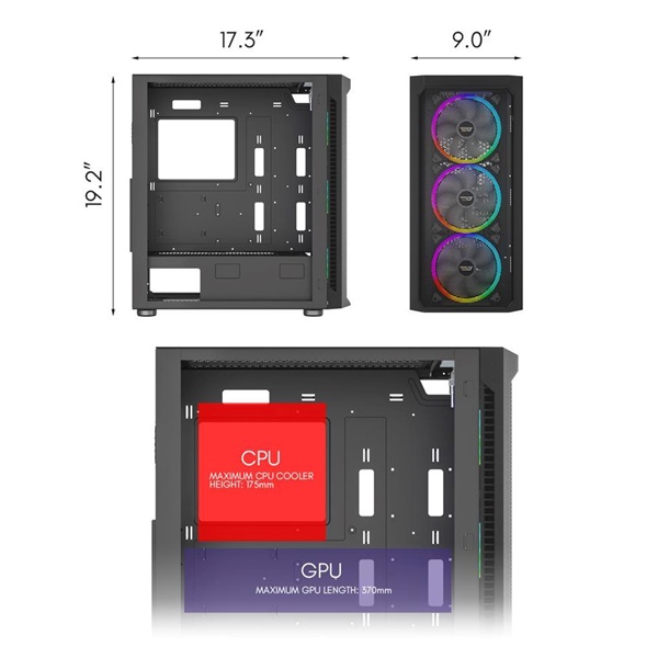 Case Material: Mesh / SPCC / Tempered Glass Supporting up to 188 mm CPU Cooler Iron Mesh Front Panel 4-Fans Included
