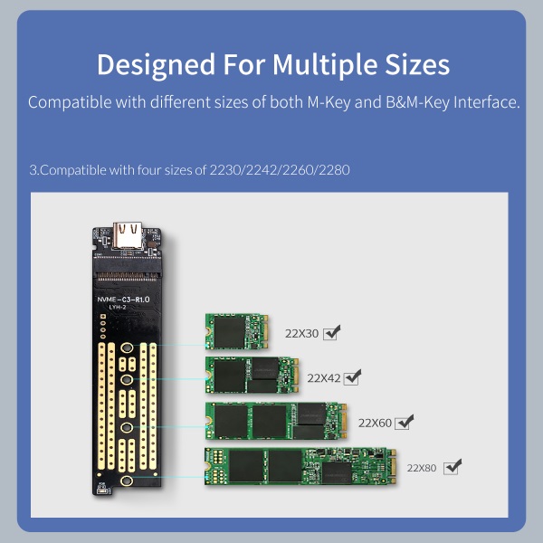- Compatible with four different specifications of M.2 NVME 2230,2242,2260,2280 SSD, up to 2000 MB/s transmission rate.