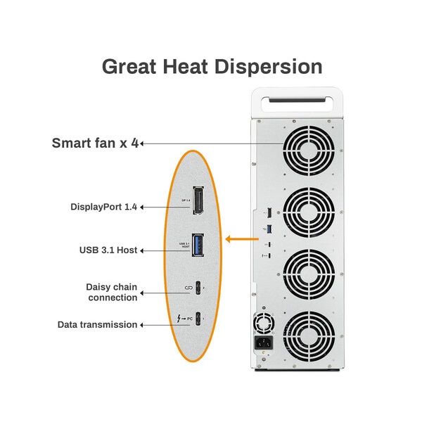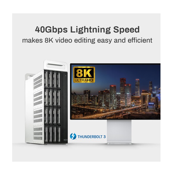 288 TB Storage Capacity (18 TB drive x 16) RAID 0, 1, 5, 6, 10, 50, Single Disk, JBOD 16 x 2.5″ / 3.5″ Drive Bays 2 x Thunderbolt 3 Ports 2817 MB/s Max Read Speed 2022 MB/s Max Write Speed Supports Windows and Mac OS
