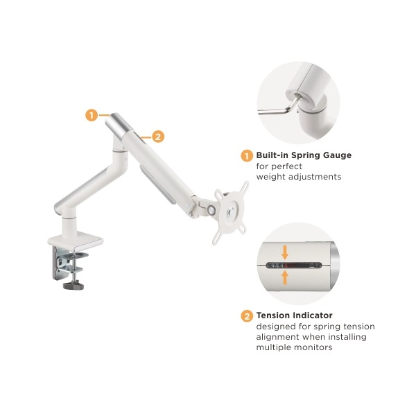●Detachable VESA Plate Design: enables easy installation ●Built-in Spring Tension Mechanism: for perfect weight adjustments ●Tension Indicator: designed for spring tension alignment when installing multiple monitors ●180° Rotation Stop: prevents monitor arm from swinging into screens or walls ●Built-in Cable Management: for an organized and neat workspace