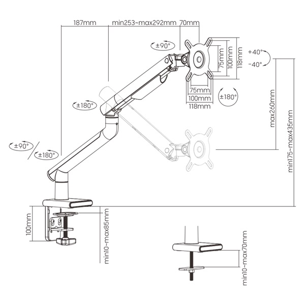 ●180° Rotation Stop: prevents monitor arm from swinging into screens or walls
