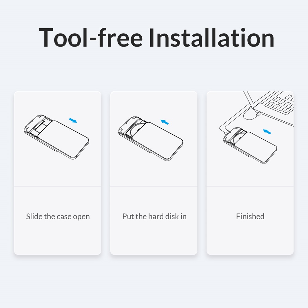 2.5″ SATA HDD/SSD with thickness 7mm-9.5mm USB Type-C/Male to USB Type-C/Male, 0.5m Tool free Installation Slide the case open