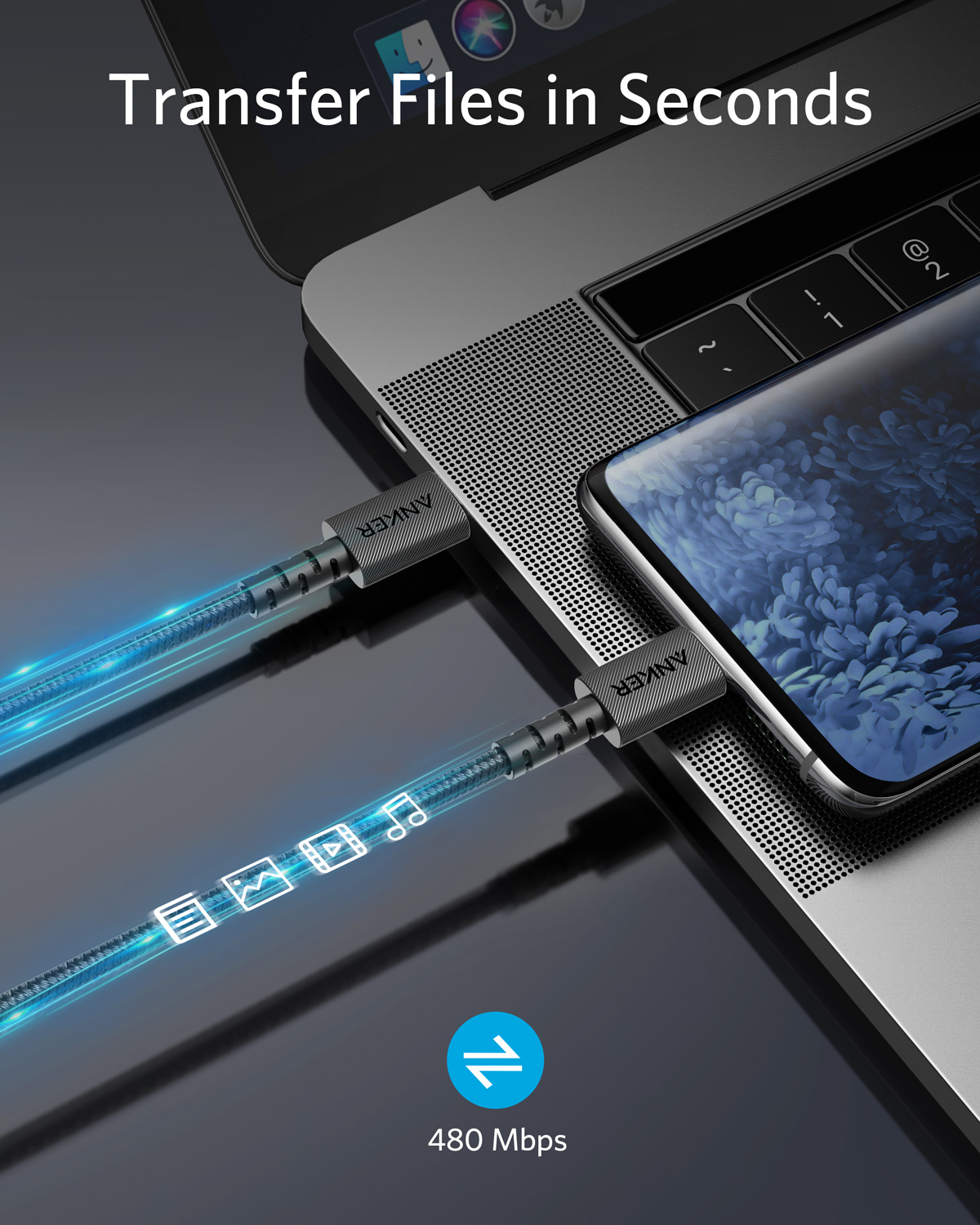 Anker PowerLine Select+ USB-C to USB-C (1.8m/6ft) -Black Charges phones and tablets with USB-C ports at high speed. Transfer speeds of 480 Mb/s, or 100 songs every 5 seconds. Compatible with USB-C device Double-braided nylon exterior Toughened Aramid Fiber Core