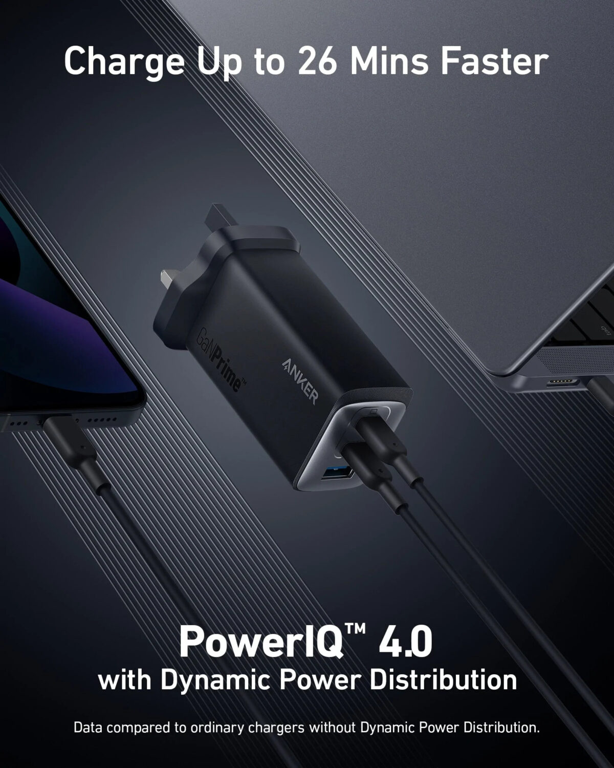Anker 737 Charger (GaNPrime 120W) -Black Equipped with 2 USB-C ports and one USB-A port, you can charge your phone, tablet, and notebook all at once from a single charger. Connect a single device to charge at up to 100W. Charge Up to 26 Minutes Faster PowerIQ 4.0 technology features Dynamic Power Distribution ActiveShield 2.0 technology enhances protection Greener with GaN