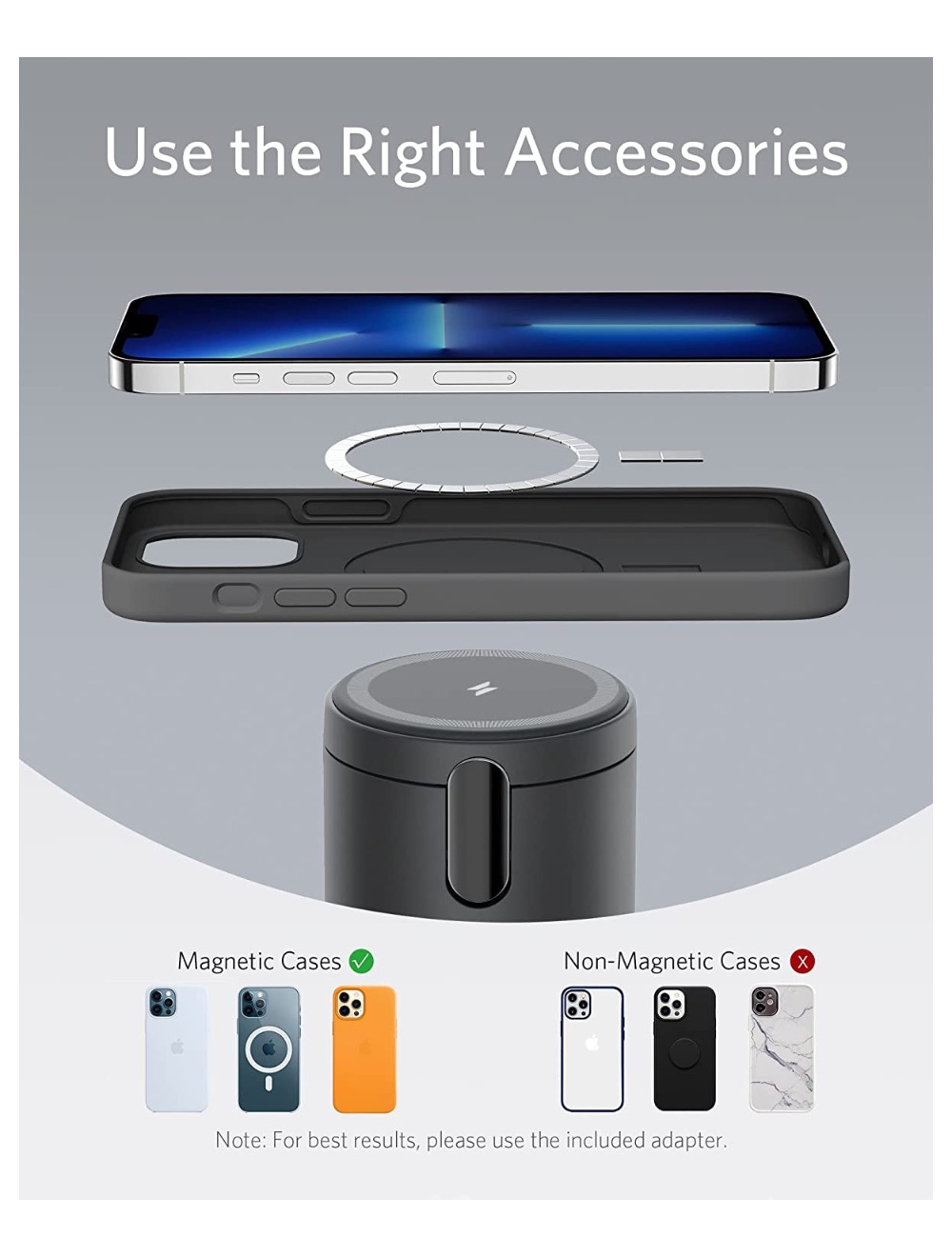 Anker 2 in 1 MagGo Magnetic Wireless Charger Supports simultaneous wireless charging of your iPhone 13/12 and earbuds in a single place. Time to get rid of those messy cables.Flip up the phone-charging platform to a maximum range of 60° and attach your iPhone horizontally or vertically for perfect viewing pleasure.Save valuable space with a versatile magnetic charging station that can quickly power up your iPhone and earbuds and is 40% smaller than a soda can.The non-slip base keeps the charging station in place and prevents sliding when charging. It also features a sleep-friendly LED indicator that shows you the charging status.