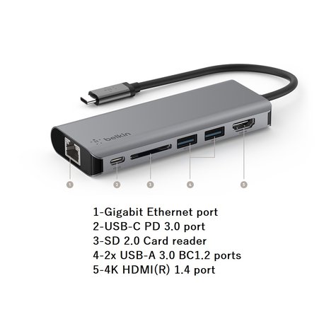 Belkin Connect USB-C Gigabit Ethernet port USB-C PD 3.0 port SD 2.0 Card reader 2x USB-A 3.0 BC1.2 ports 4K HDMI(R) 1.4 port