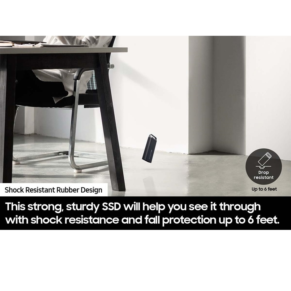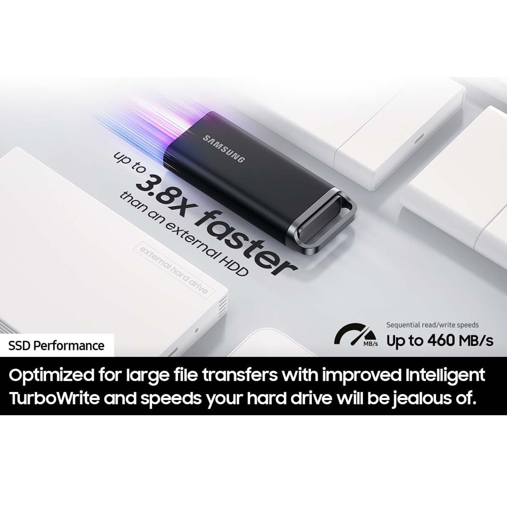 SAMSUNG T5 EVO 8TB Storage Capacity USB-C 3.2 Gen 1 Interface (5 Gb/s) Up to 460 MB/s Data Transfer Rate AES 256-Bit Hardware Encryption Rubber Skin Design Integrated Hook
