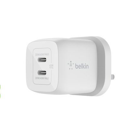 اشحن جهاز MacBook †† أو اشحن جهاز iPhone 13 وGalaxy بسرعة في نفس الوقت باستخدام شاحن الحائط المزدوج USB-C القوي وصغير الحجم. يتضمن تقنيات شحن GaN وUSB-C PD 3.0 وPPS، مما يوفر شحنًا سريعًا وآمنًا لن يسخن أو يزيد الشحن. يمكنك الوصول إلى ما يصل إلى 45 وات من الطاقة عند استخدام منفذ واحد لجهاز MacBook Pro الخاص بك أو ما يصل إلى 25 وات من المنفذ العلوي وما يصل إلى 20 وات من المنفذ السفلي عند استخدام كليهما. تصميمه المدمج يجعله مثاليًا للسفر أو كشاحن في المنزل.