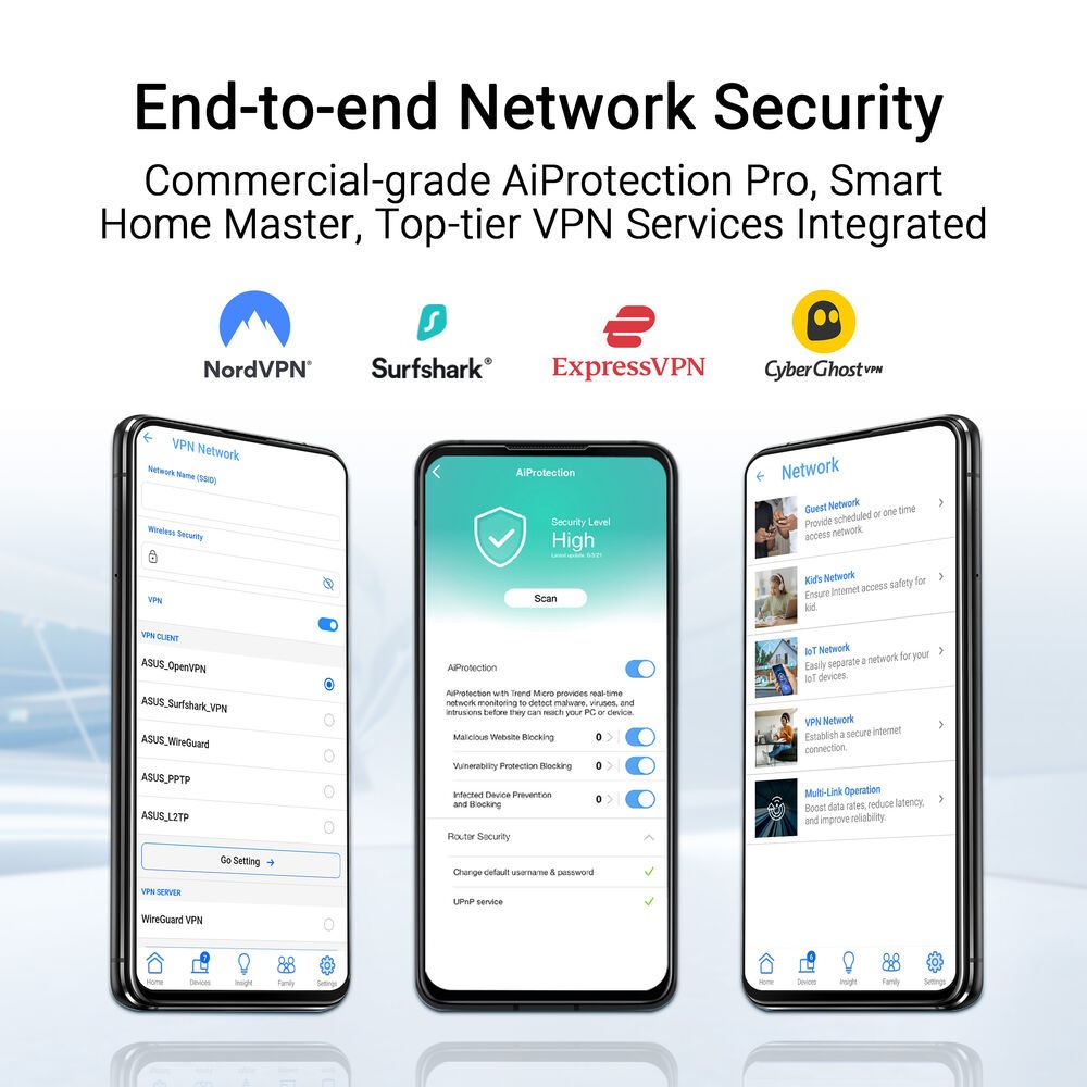 ASUS RT-BE58U User Interface WEB: ASUSWRT Wireless router mode Access point mode Media bridge mode 1x 2.5G for WAN/LAN 1x 1G for WAN/LAN 3 x 1G LAN AiMesh, Parental Control Traffic Control MU-MIMO