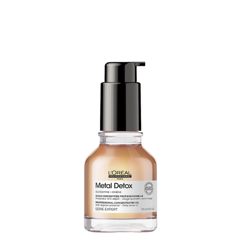 This Serie Expert Metal Detox Oil neutralizes and removes metal from hair to stop hair breakage and color change. With every wash, the metal penetrates the fiber of your hair. Metal particles create a risk of breaking and color change. Enriched with Glucosamine, this concentrated oil protects hair from particle deposit.