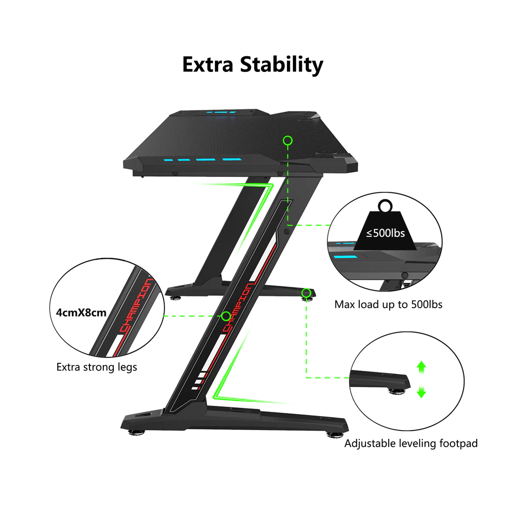 60″ with Extra Large carbon fiber texture Top RGB LED light effects Larger mouse pad (600 x 800mm) Headset hook, Cup Holder, Gamepad holder (Optional) Rock solid Z Shaped Leg Design