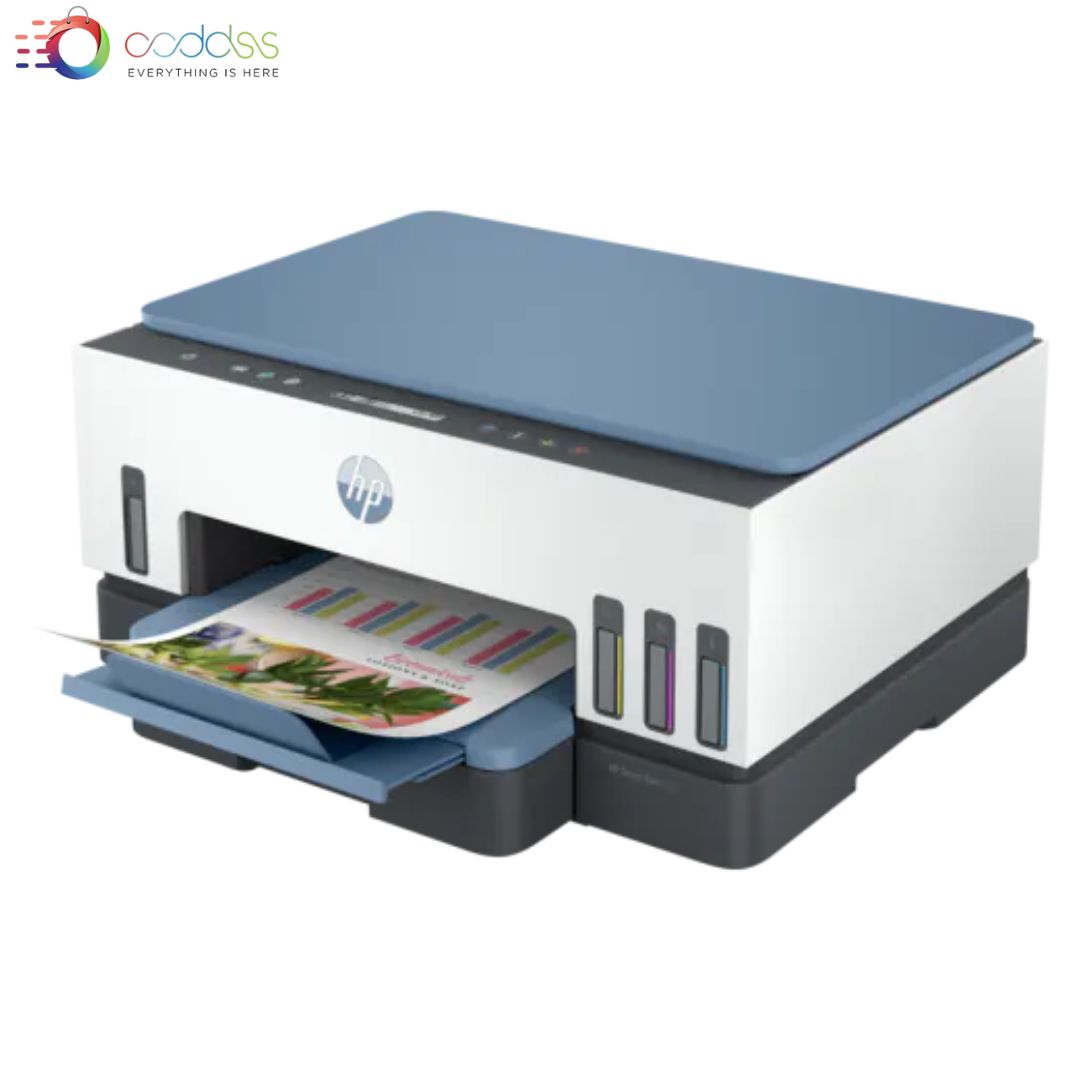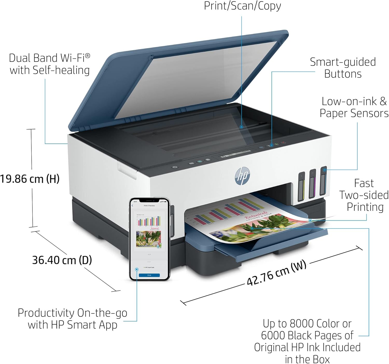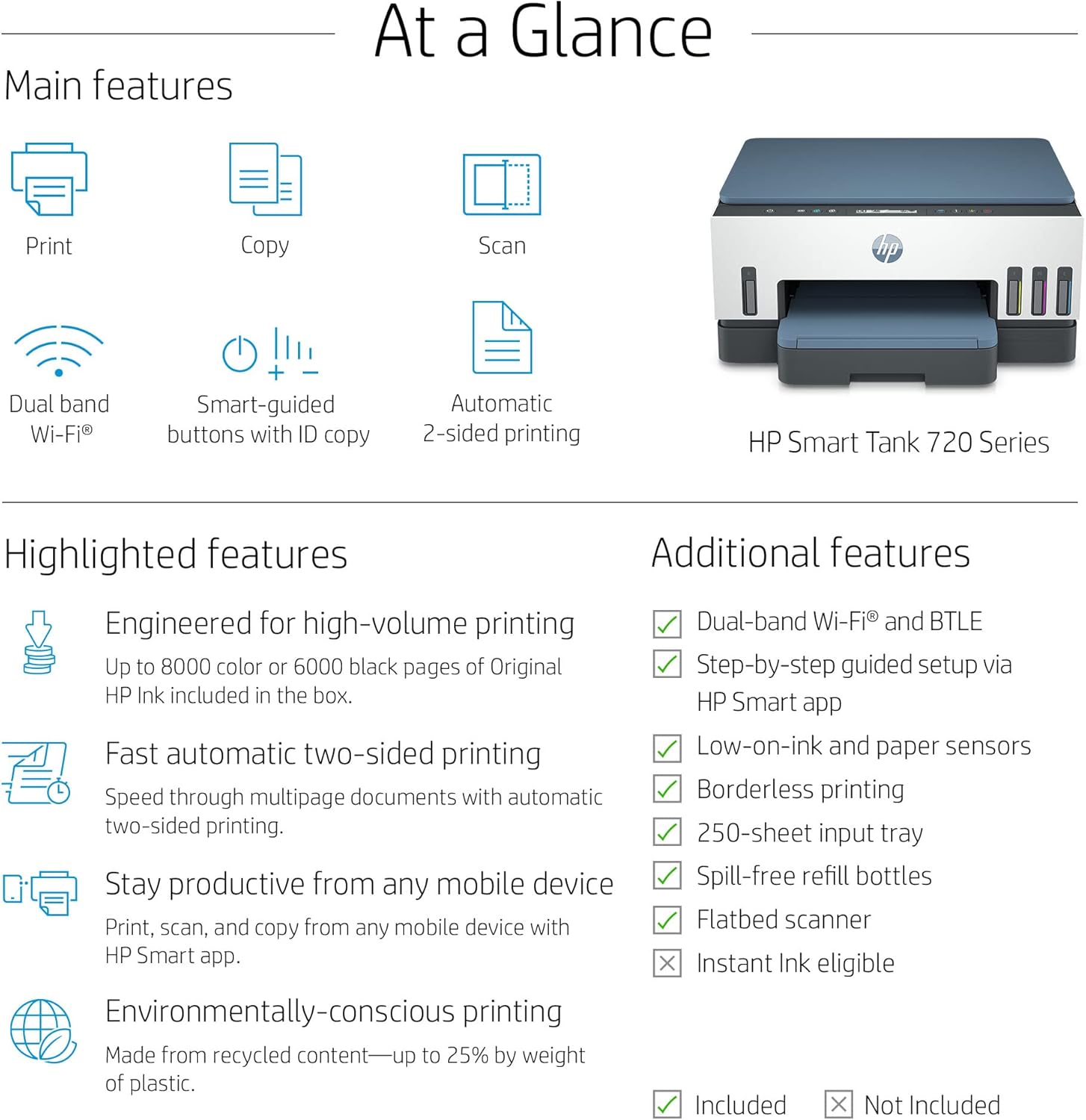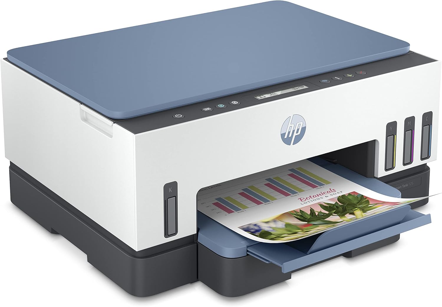 HP Smart Tank 725 All-in-One; 3 x HP GT53XL 135-ml Black Original Ink Bottle; HP GT52 Cyan Original Ink Bottle; HP GT52 Magenta Original Ink Bottle; HP GT52 Yellow Original Ink Bottle; Power cord; HP Black color printhead; HP Tri color printhead; Setup guide; Reference guide; Ink caution flyer; Regulatory flyers; warranty flyers