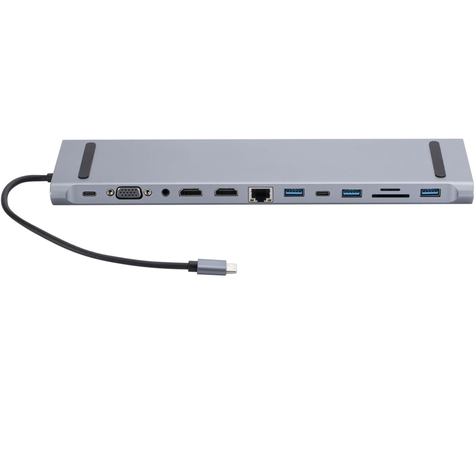 USB-C Hub 1x VGA 2x HDMI 1x USB-C 3x USB 3.0 1x USB-C Male 1x Audio 3.5mm 1x Ethernet 1Gbps 1x SD Card Reader 1x TF Card Reader 1x USB-C (Power for Dock)