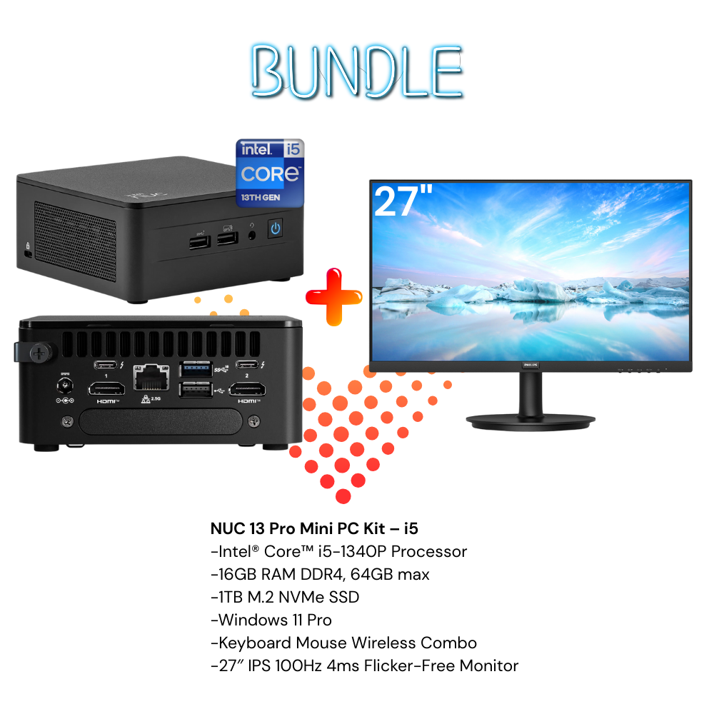 ASUS NUC 13 Pro Mini PC Kit – i5 -Intel® Core™ i5-1340P Processor -16GB RAM DDR4, 64GB max -1TB M.2 NVMe SSD -Windows 11 Pro -Keyboard Mouse Wireless Combo -27″ IPS 100Hz 4ms Flicker-Free Monitor