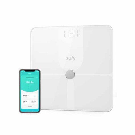 Uvi B1 scale from Anker _ compatible with Fitbit programs, Google Fit, Apple healthy _ Uses up to 16 users _ works on measuring 14 features _ works on measuring weight, fat percentages, body mass, muscle mass, bone mass, water percentage in the body , full body mass index, estimating the amount of energy by measuring BMR, visceral fat percentage - calculating body age and stages of formation - powered by AAA3 battery